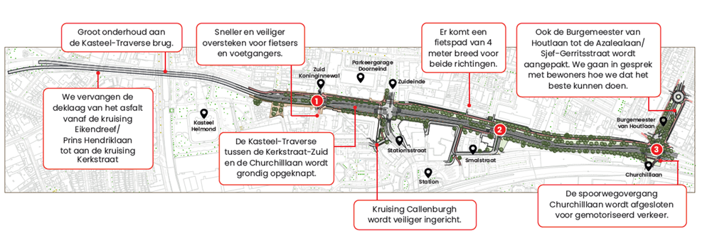 Het voorlopige ontwerp is klaar en BAM Infra en de gemeente Helmond werken dit jaar samen toe naar een definitief ontwerp. In dat ontwerp wordt de Kasteel-Traverse veiliger door de verbinding tussen Helmond-Noord en Helmond-Zuid, inclusief de kruispunten, te verbeteren. Daarbij maken we het meteen gemakkelijker om te voet of per fiets het centrum te bereiken.