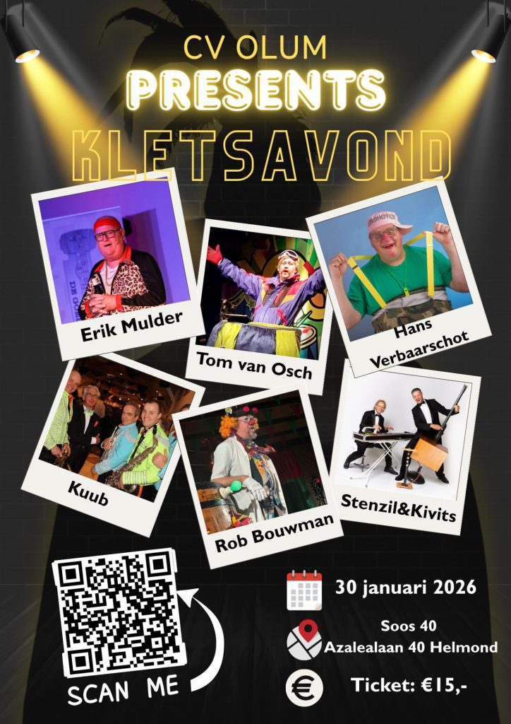 CV OLUM organiseert op vrijdag 30 januari haar jaarlijkse kletsavond en hier zullen de crème de la crème van de Brabantse top kletsers acte de présence geven. Samen met top amusement uit de regio, de dansgardes en de hofkapel zullen zij zorgen voor wederom de gezelligste kletsavond van Helmond en omstreken in Soos40!