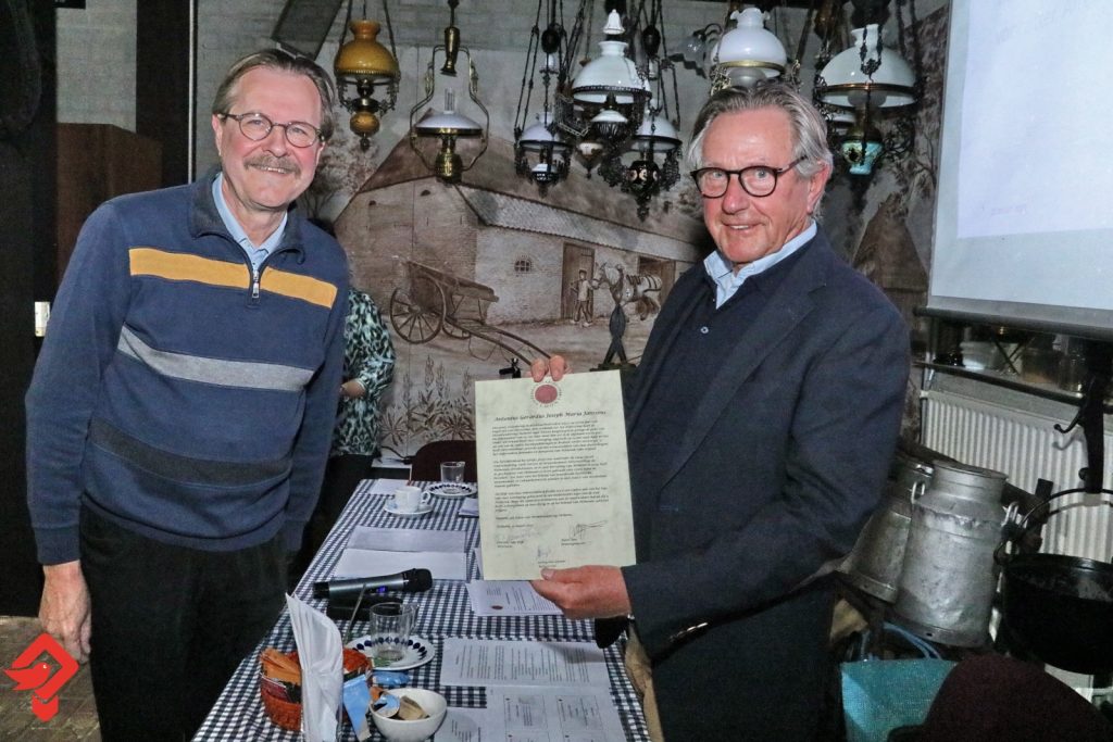 Het bestuur is hierdoor op zoek gegaan naar een kandidaat, die deze voorzittersstoel wilde gaan bezetten. Dat deze zoekmissie niet eenvoudig was, hebben ze wel ervaren. In deze tijd staan kandidaten niet meer te trappelen, voor een bestuursfunctie. Uiteindelijk is een kandidaat gevonden en is hij tijdens deze ALV voorgedragen aan de vergadering. Na zijn uitgebreide voordracht, werd hij door aanwezigen met een grote meerderheid gekozen. Dit betekende het einde van het voorzitterschap van Ton Janssens. Hij werd bedankt, voor zijn tomeloze inzet met enkele mooie cadeaus en een mooie grote rode Heemkundekring Helmont penning.