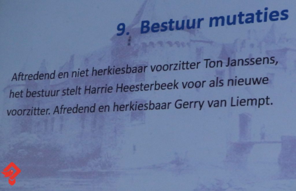 De nieuwe voorzitter is Harrie Heesterbeek geworden. In zijn werkzame leven was hij tandarts in Stiphout en is ook geïnteresseerd in de Helmondse historie. Hij heeft zich in het voor traject uitgebreid laten voorlichten over de functie die hij zou gaan bemannen, als hij gekozen zou worden. Hij werd door de leden veel succes gewenst, in deze nieuwe functie voor hem.